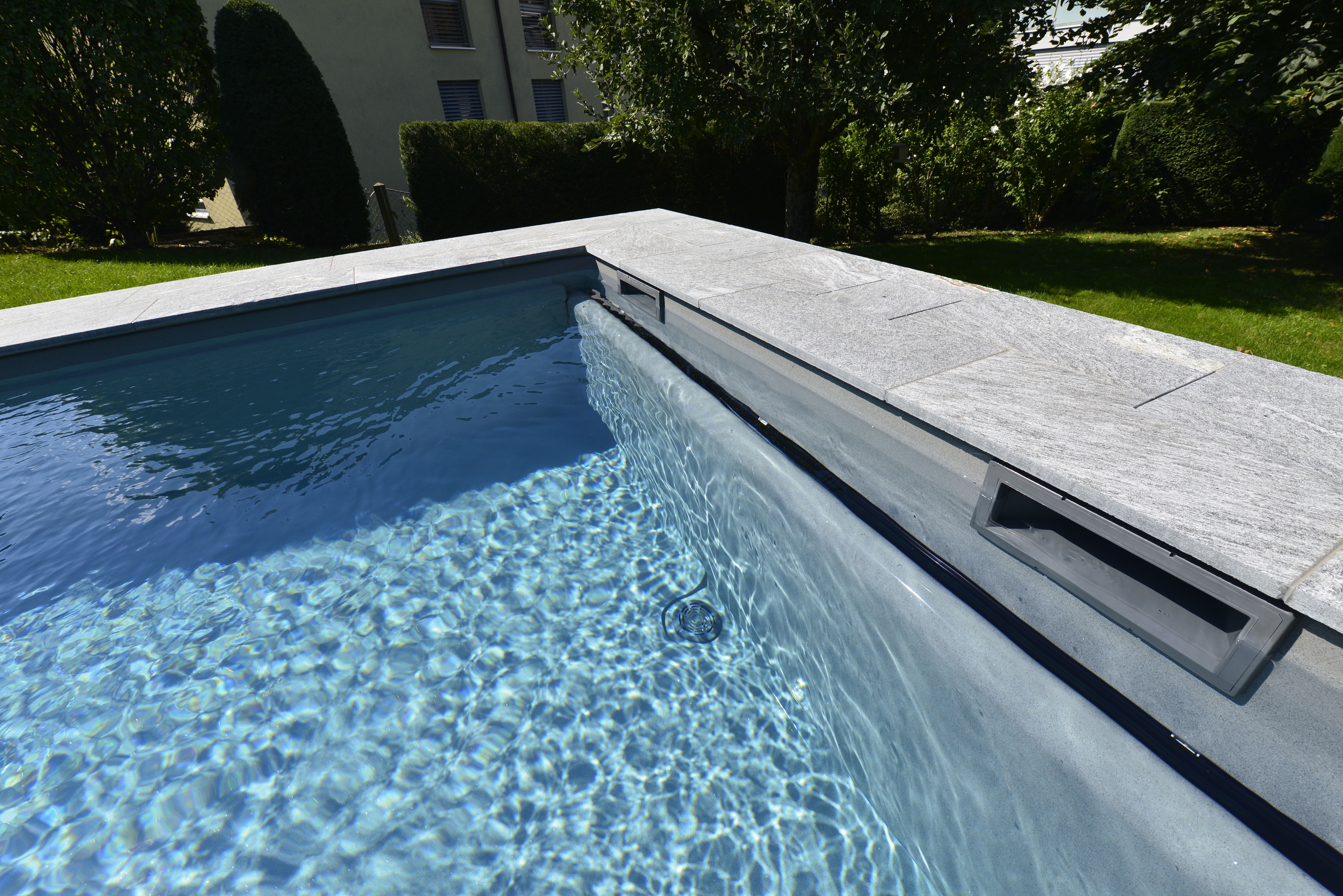 Dank sorgfältiger Planung konnten wir das Becken exakt auf die gewünschte Höhe setzen und optimal ins bestehende Gelände integrieren. Die hochwertigen Randsteinplatten sowie die Verkleidung rund um den Beton runden das Gesamtbild harmonisch ab und verleihen der Anlage eine moderne Ausstrahlung.