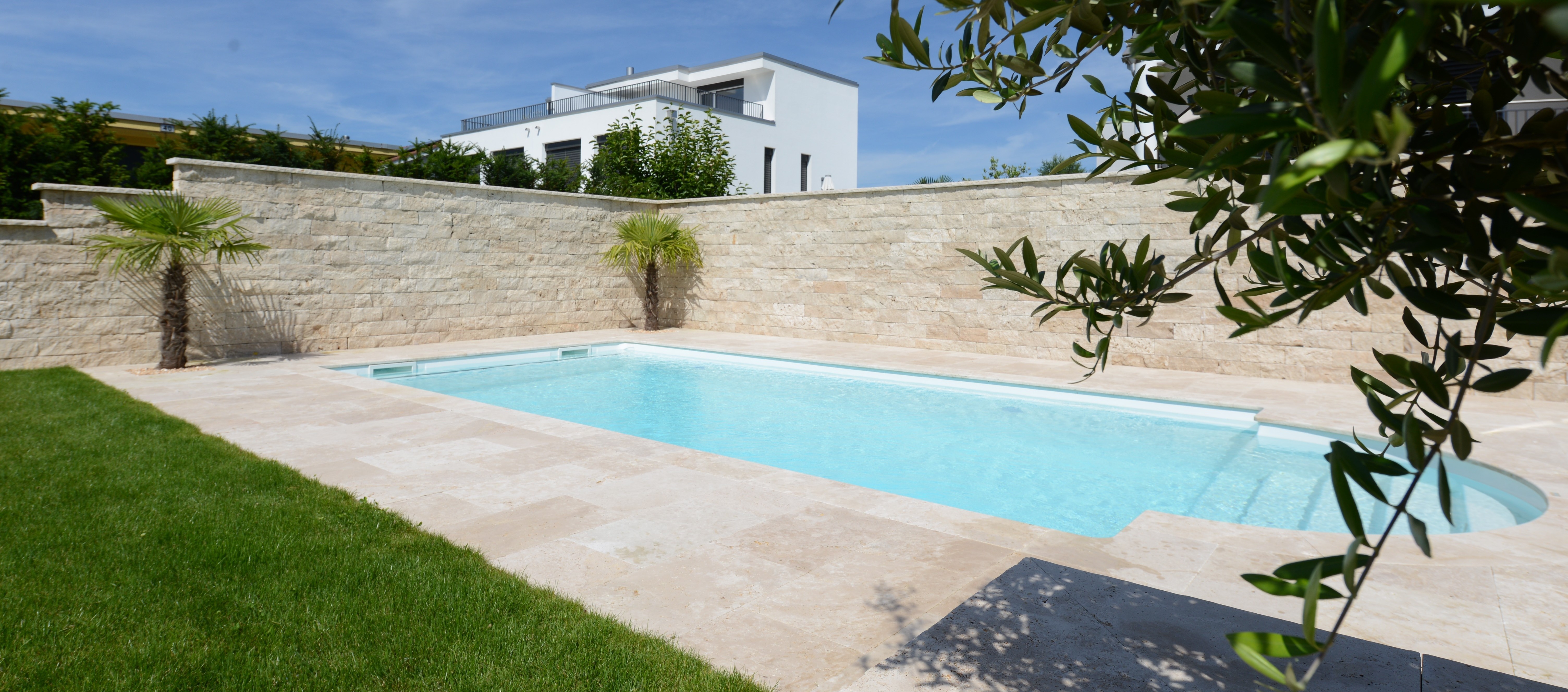 Das Römerbecken wird in eher selten gewählt – umso erfreulicher ist es, dass diese Familie eine ausgezeichnete Entscheidung getroffen hat. Es passt nicht nur perfekt zum neuen Sichtschutz und der Mauer, sondern fügt sich auch harmonisch in das Gesamtkonzept des Gartens ein. Die Anlage wurde zusätzlich mit einer hochwertigen Dosieranlage ausgestattet, die den Betrieb so einfach wie möglich gestaltet. Kanister für Chlor und pH-Minus müssen lediglich ausgetauscht werden, während die Technik den Rest zuverlässig übernimmt. So kann die Familie den Garten und das Schwimmen uneingeschränkt geniessen, ohne sich um aufwändige Wartung kümmern zu müssen.