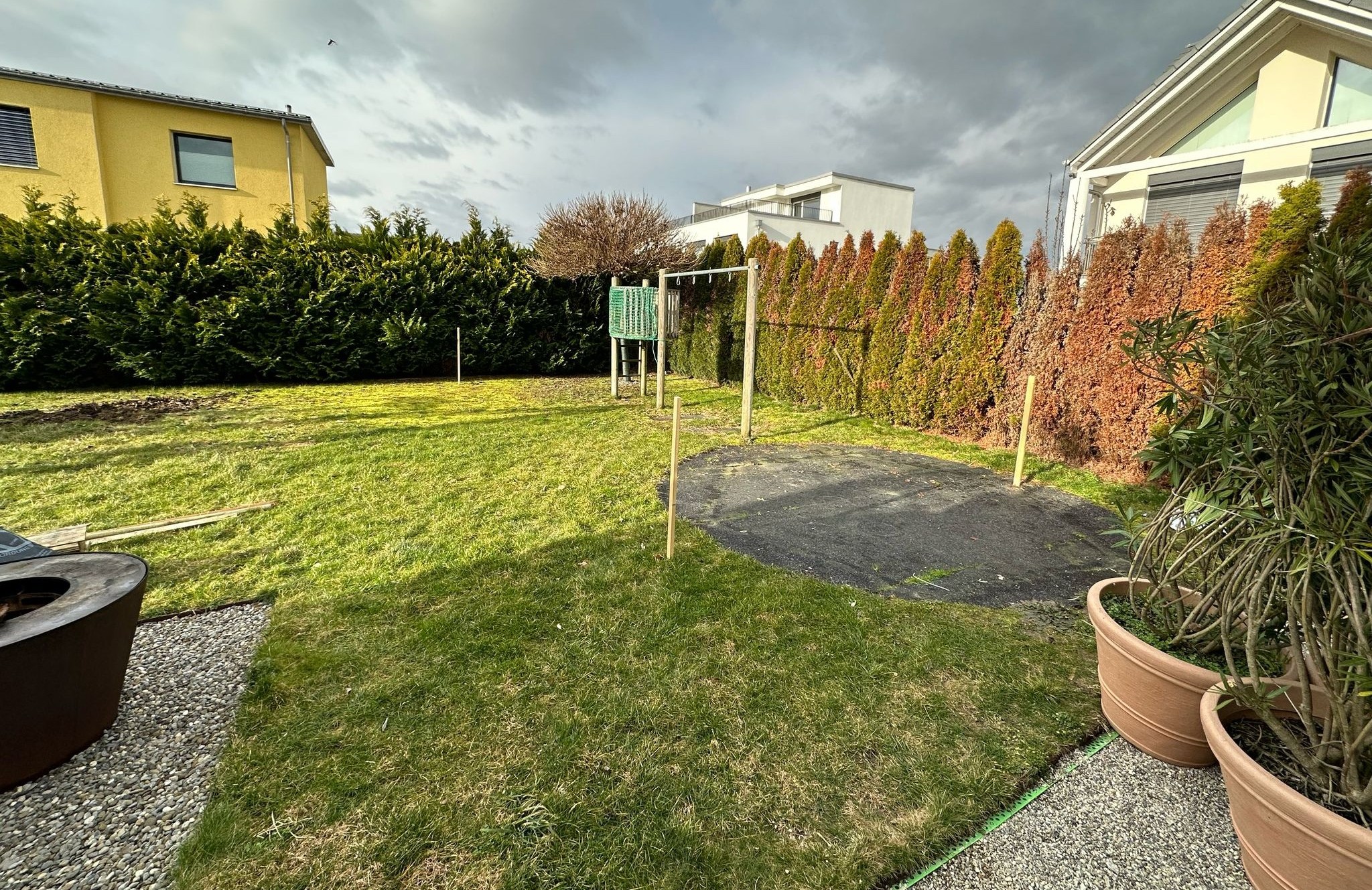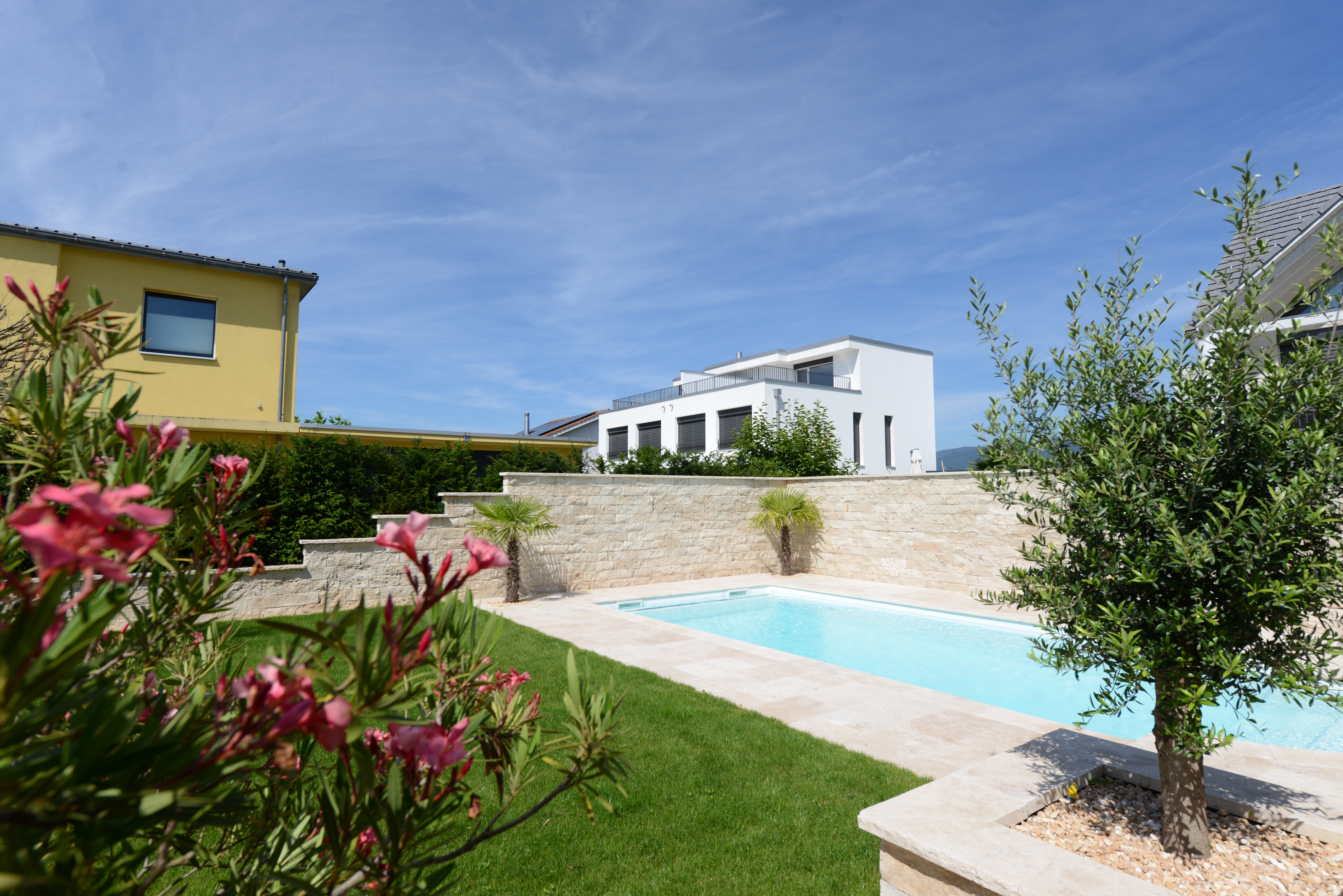 Bereits bei den ersten Besuchen vor Ort wurden die Wünsche und Vorstellungen der Familie gemeinsam besprochen, und es entstanden die ersten Pläne für die Neugestaltung. Nach sorgfältiger Abstimmung und der Zusage der Offerte konnten wir das Baugesuch erstellen, das anschliessend genehmigt wurde. Mit der Bewilligung in der Hand starteten die Bauarbeiten, und der Garten wurde Schritt für Schritt in ein vielseitiges Refugium verwandelt. Das weisse Römerbecken fügt sich harmonisch in den rechten Bereich des Gartens ein und lädt zu entspannten Stunden im Wasser ein.