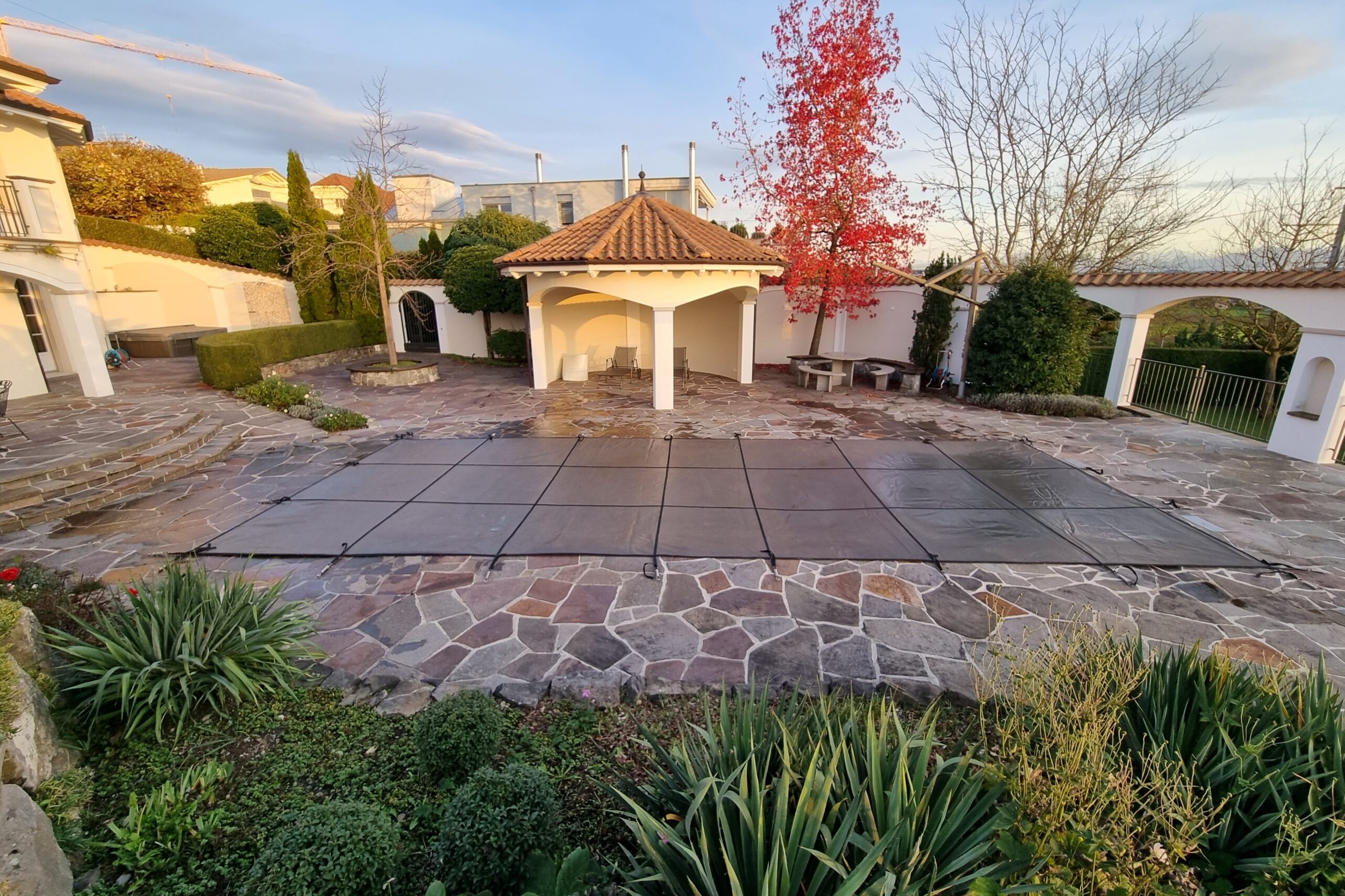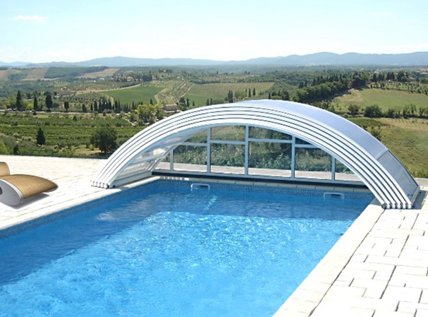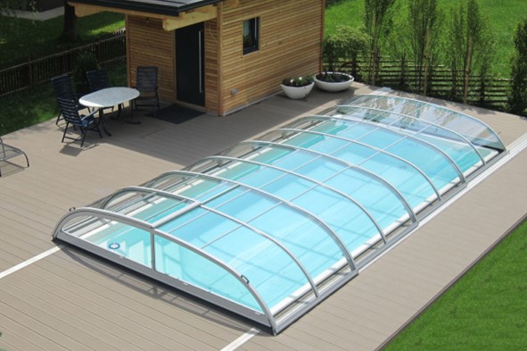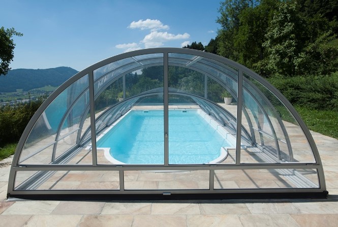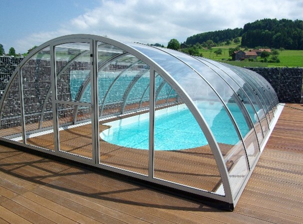 Eine weitere Möglichkeit ein Schwimmbad zu decken bietet die Überdachung. Diese kindersichere Abdeckung schützt vor Schmutz, wärmt das Wasser und kann bei schönem Wetter vollständig geöffnet werden. Überdachungen werden auf Mass gefertigt und sind in verschiedenen Ausführungen erhältlich.